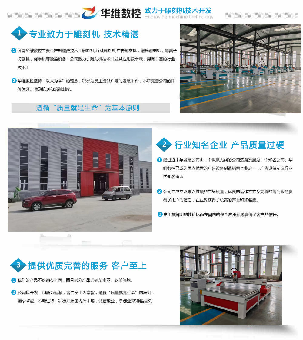濟(jì)南華維數(shù)控主要生產(chǎn)制造數(shù)控木工雕刻機(jī),石材雕刻機(jī),廣告雕刻機(jī),激光雕刻機(jī),等離子切割機(jī),刻字機(jī)等數(shù)控設(shè)備!公司致力于雕刻機(jī)技術(shù)開(kāi)發(fā)及應(yīng)用數(shù)十載,擁有豐富的行業(yè)技術(shù)! 華維數(shù)控堅(jiān)持“以人為本”的理念,積極為員工提供廣闊的發(fā)展平臺(tái),不斷完善公司的評(píng)價(jià)體系、激勵(lì)機(jī)制和培訓(xùn)制度。經(jīng)過(guò)近十年發(fā)展公司由一個(gè)默默無(wú)聞的公司發(fā)展為一個(gè)知名公司。華維數(shù)控已逐漸成為國(guó)內(nèi)優(yōu)秀的廣告設(shè)備制造銷售企業(yè)之一,廣告設(shè)備制造行業(yè)的優(yōu)秀企業(yè)。公司自成立以來(lái)以過(guò)硬的產(chǎn)品質(zhì)量,優(yōu)良的運(yùn)作方式及完善的售后服務(wù)贏得了用戶的信任,在業(yè)界獲得了較高的聲譽(yù)和知名度...