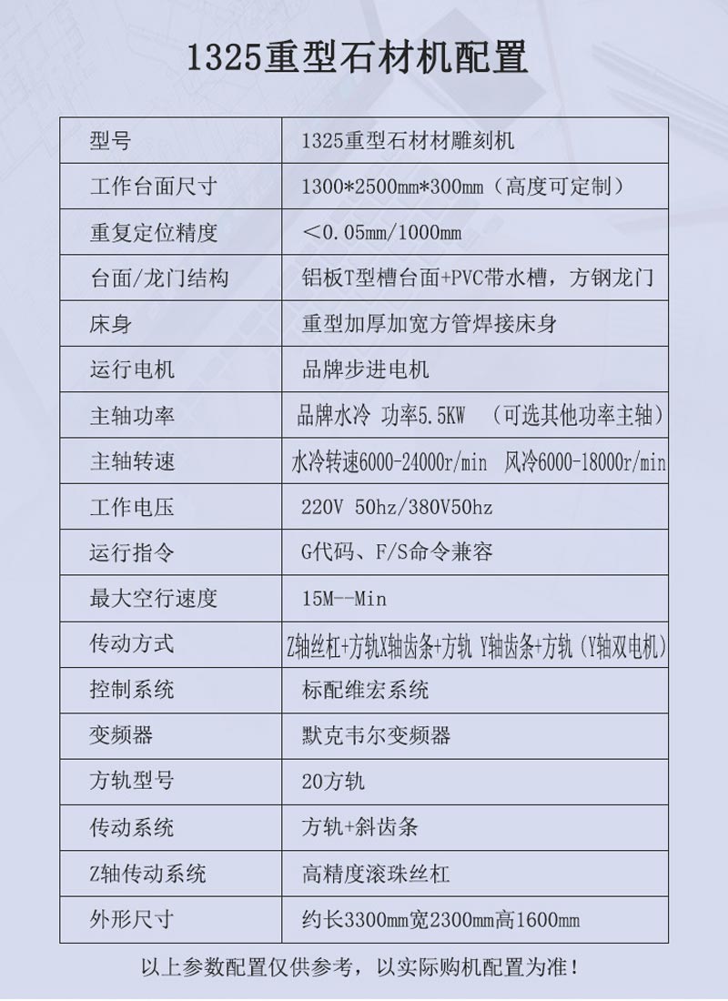 Name & nbsp;  call Participate & nbsp;                number Single & nbsp;   position Type & nbsp;  number SW-6090 SW-1212 SW-1318 SW-1224   resolving power zero point zero zero three zero point zero zero three zero point zero zero three zero point zero zero three Millimeter/pulse Spindle motor one thousand and five hundred one thousand and five hundred one thousand and five hundred one thousand and five hundred tile Maximum speed of spindle motor twenty-four thousand twenty-four thousand twenty-four thousand twenty-four thousand Conversion/Minute Knife handle diameter %3.175 %6 %3.175 %6 %3.175 %6 %3.175 %6 millimeter Maximum aerodynamic speed eight eight eight eight Meter per minute Maximum carving size 600*900*100 1300*1200*100 1300*1800*100 1260*2460*100 millimeter External dimensions 1000*1200*1250 1760*1700*1250 1760*2200*1250 1760*3000*1250 millimeter supply voltage 220V50HZ 220V50HZ 220V50HZ 220V50HZ Volt/Hertz weight four hundred six hundred eight hundred nine hundred and eighty kg . power waste two point eight one point six one point six one point six Kilowatt The bed body is cast as a whole to ensure minimal deformation, good rigidity, and high strength. ◆ Adopting German high-precision screw drive, high precision, fast speed, and strong force. ◆ Adopting imported Taiwan Shangyin HIWN square linear guide rail, with high precision, large load-bearing redundancy, and long service life. ◆ Fully optimized mechanical and electrical design, selecting various electrical components to minimize the failure rate. The machine tool is equipped with a water tank and an automatic water supply cooling system. ◆ All dust-proof and waterproof designs provide comprehensive protection for machine transmission components.   Application scope: 3D relief and line carving, cutting, edging, drilling 2D carving of natural marble, jade, granite, artificial stone, tombstones, milestones, tiles, glass and other materials. Hot stamping plate, hot stamping mold, small metal carving, metal relief processing. National Unified Sales Hotline: 400-6587-688 Jinan Huawei CNC Equipment Co., Ltd Address: No. 18-1 Tonghua Road, Jinan City, Shandong Province Postal Code: 250000 Phone: 0531-88620266 Fax: 0531-88276988 Mobile phone: 15853195586 E-mail: cncmachine@jnhwcnc.com {1} {2} {3} {4} {5} {6} {7} {8} {9} {10} {11} {12} {13} {14} {15} {16} {17} {18} {19} {20} {21} {22} {23} {24} {25} {26} {27} {28} {29} {30} {31} {32} {33} {34} {35} {36} {37} {38} {39} {40} {41} {42} {43} {44} {45} {46} {47} {48} {49} {50} {51} {52} {53} {54} {55} {56} {57} {58} {59} {60} {61} {62} {63} {64} {65} {66} {67} {68} {69} {70} {71} {72} {73} {74} {75} {76} {77} {78} {79} {80} {81} {82} {83} {84} {1} {2} {3} {4} {5} {6} {7} {8} {9} {10} {11} {12} {13} {14} {15} {16} {17} {18} {19} {20} {21} {22} {23} {24} {25} {26} {27} {28} {29} {30} {31} {32} {33} {34} {35} {36} {37} {38} {39} {40} {41} {42} {43} {44} {45} {46} {47} {48} {49} {50} {51} {52} {53} {54} {55} {56} {57} {58} {59} {60} {61} {62} {63} {64} {65} {66} {67} {68} {69} {70} {71} {72} {73} {74} {75} {76} {77} {78} {79} {80} {81} {82} {83} {84}
