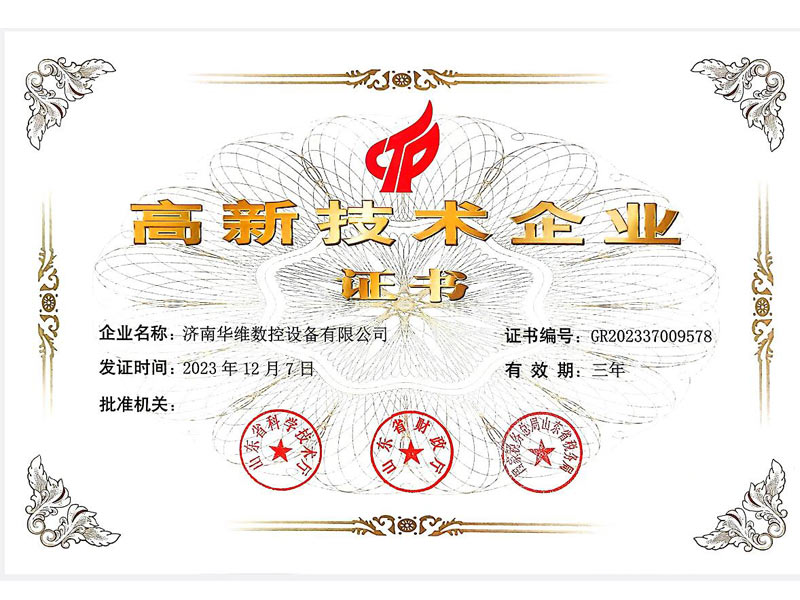 熱烈祝賀濟(jì)南華維數(shù)控設(shè)備有限公司于2023年12月榮獲國家高新技術(shù)企業(yè)榮譽(yù)證書!作為一個高新技術(shù)企業(yè),濟(jì)南華維數(shù)控設(shè)備有限公司在技術(shù)創(chuàng)新和研發(fā)領(lǐng)域 取得了顯著的成就,這是一項令人矚目的成就,值得公司全體員工和合作伙伴共同慶祝。